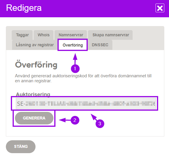 Gå sedan till Överföring, och tryck Generera och kopiera koden som kommer i Auktoriserings fältet.