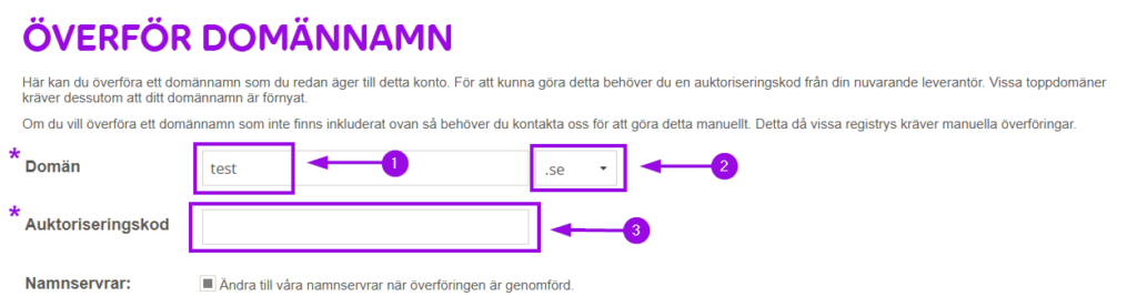 1. Ange domännamnet, välj TLD (.se som exempel) och ange Auth/EPP-kod som du fått från tidigare registrar.