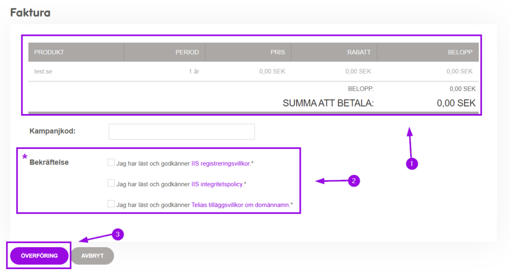 1. Kontrollera produkt och summa, läs och bekräfta villkoren och tryck sedan på Överföring.